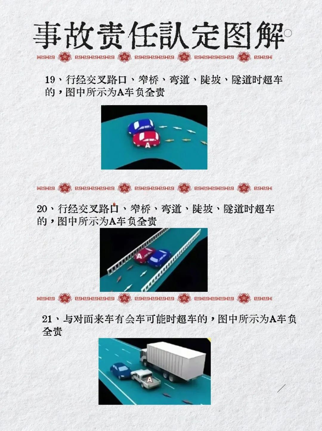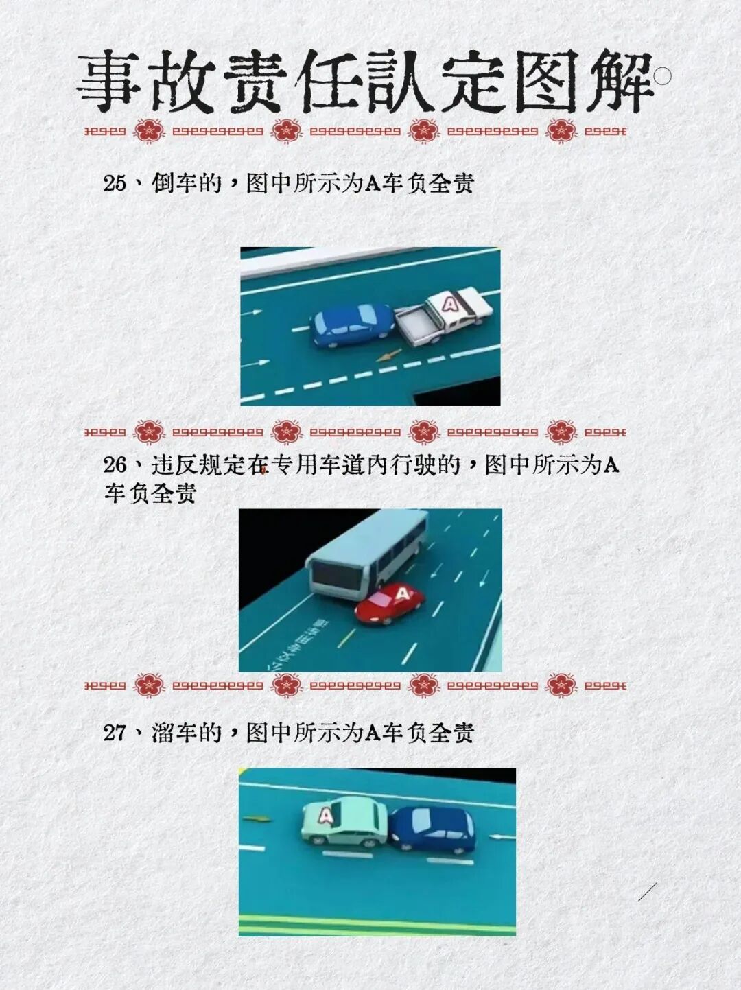 首页 > 交通法务 > 当前 收藏!典型道路交通事故图解大全,38种责任认定[交通事故] 2024-12-14 09:01:17 来源于: http://www.claw8.cn/ 以上图解主要适用简易程序处理的交通事故,包括:(一)财产损失事故;(二)受伤当事人伤势轻微,各方当事人一致同意适用简易程序处理的伤人事故。例如:《北京市道路交通事故简易程序处理规定》(修订)8月15日实施 对于伤情严重、死亡重大事故还需要综合考虑各方的交通违法行为在事故中的作用大小、因果关系综合评判认定事故责任。 《交通事故案件实务》新书,推翻道路交通事故认定书的五种方法和途径,如何提高道路交通事故复核成功率?来源:刘春城律师说法 编辑 | 田战旗 校对 | 李晓涵 审核 | 杨克军 上一篇:交通事故发生后都是怎样处理的[交通事故] 收藏!典型道路交通事故图解大全,38种责任认定[交通事故] 交通事故发生后都是怎样处理的[交通事故] 交通事故责任怎么划分[交通事故] 原创发生交通事故并不是受伤的都有理![交通事故] 上海浦东警方:S3高速周浦收费站处发生一起交通事故,致1人死亡[交通事故] 交通事故责任分为几类[交通事故] 交通事故的定义与分类有什么[交通事故] 交通事故有什么流程[交通事故] 交通事故咋样处理[交通事故] 交通事故指的是什么[交通事故]